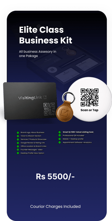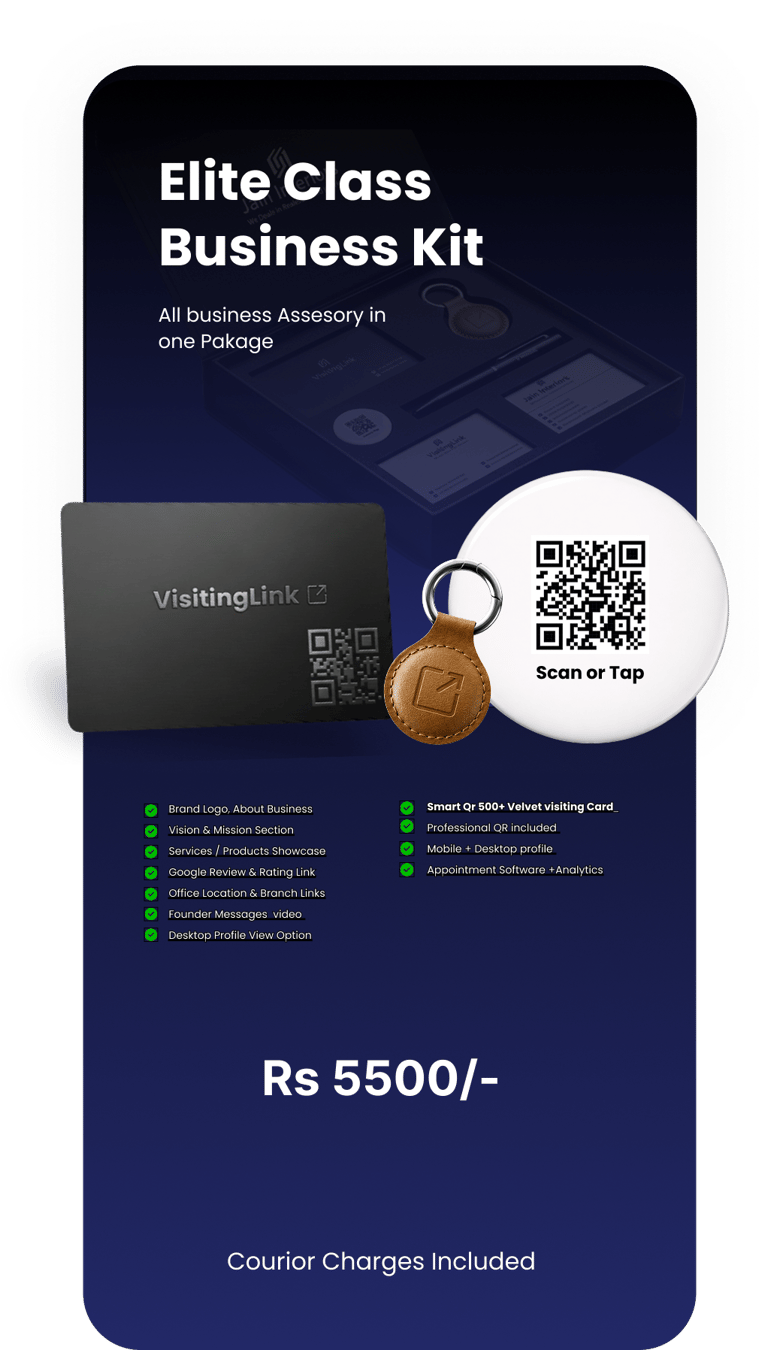 It combines smart visiting tools, digital identity, and physical premium accessories into one powerful kit — helping you create a strong, professional, and memorable first impression everywhere.